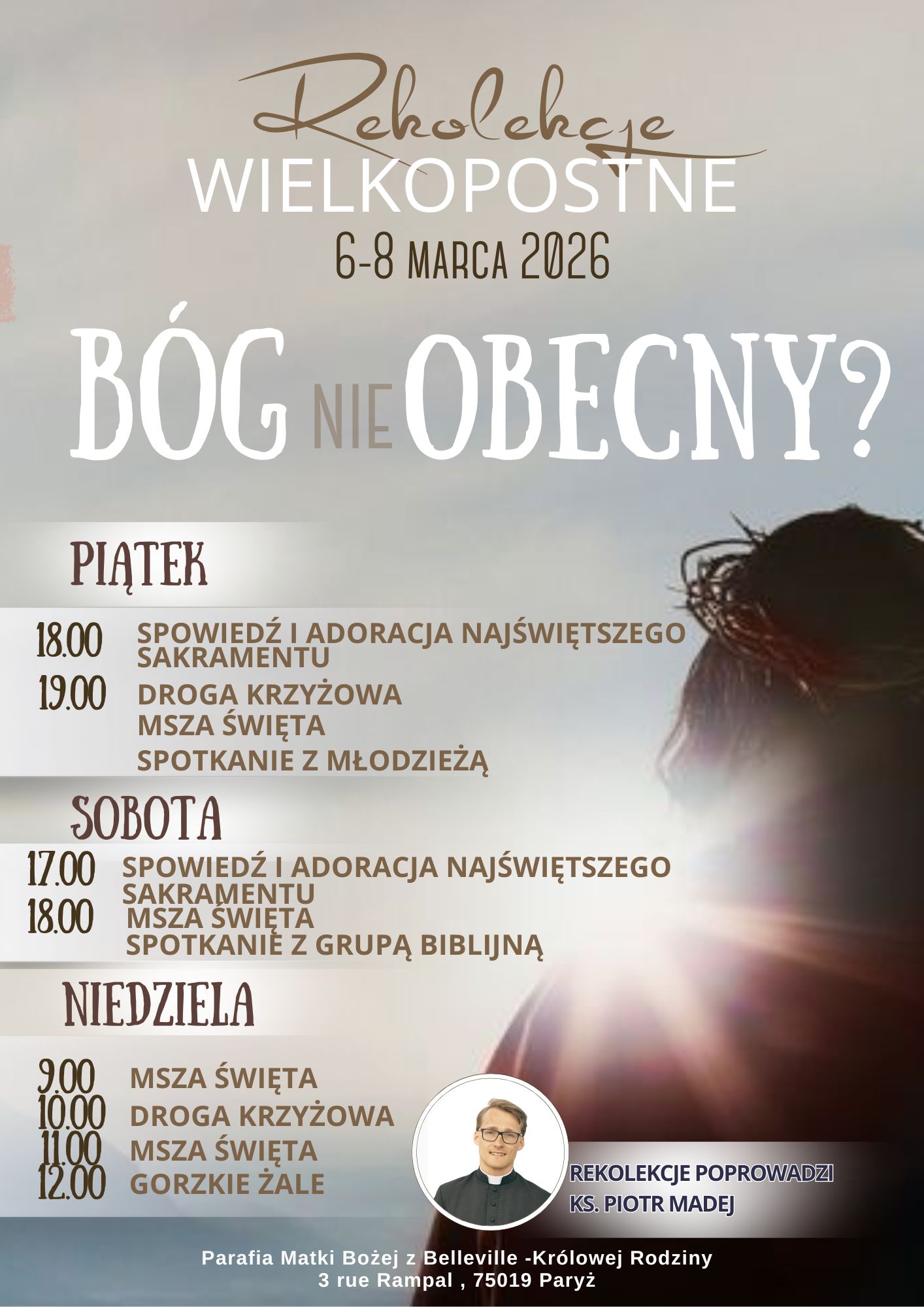 ZAPRASZAMY DO WSPÓLNOTY MODLITWY DO NASZYCH GRUP - RADY PARAFIALNEJ, SCHOLI, TEATRU, GRUPY LITURGICZNEJ Kod do bramy wejściowej: 9172 MSZE ŚWIĘTE: Piątek-19.00; Sobota - 18.00; Niedziela 9.00 i 11.00; Adoracja i S. Pokuty - sobota 17.00; Droga Krzyżowa w każdy Piątek o g. 19.00 i w niedzielę o g. 10.00; Gorzkie Żale w niedziele o 12.00